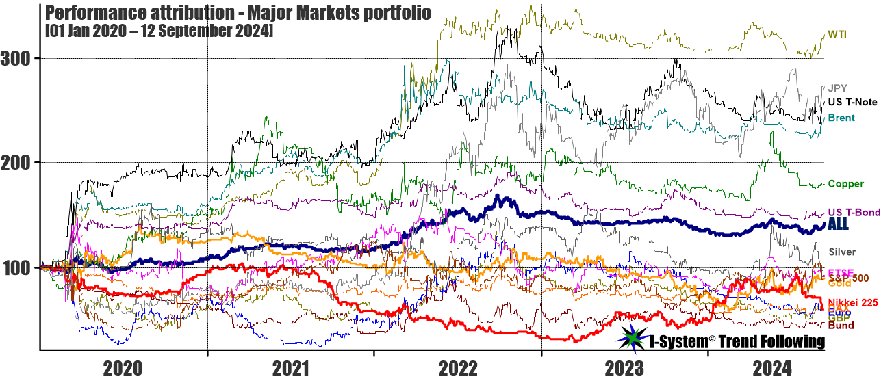 The chart below illustrates the performance attribution for each of the 15 markets included in the Major Markets portfolio (excluding Bitcoin) on an approximately equal risk-weighting basis: