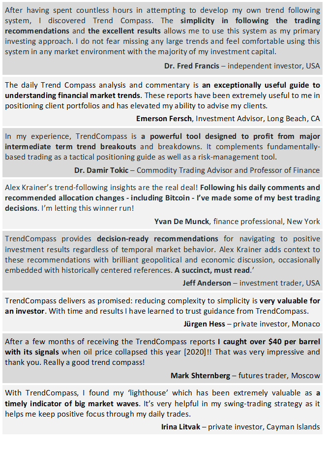 Our clients enjoy the sober, consistent quality decision support they get from TrendCompass… Here are a few testimonials from professional and non-professional investors: