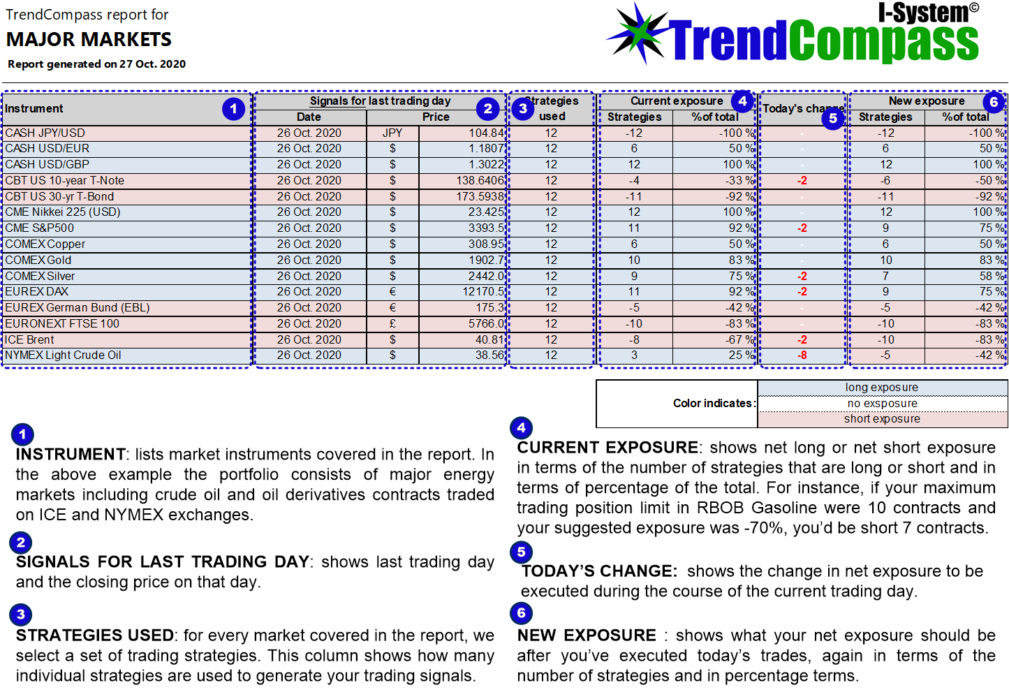 Without fail, TrendCompass will help you profit from major price trends. We worked hard to make our reports intuitive and easy to read so you can review them in just a few seconds each day. The reports consist of an e-mail with a very brief commentary, and a PDF containing a markets summary page followed by a detailed breakdown per market showing trading signals and/or trend reversals per each individual trading strategy.