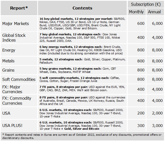 We can customize reports for clients who wish to track a different selection of markets, a larger number of strategies, or follow a particular selection of strategies (for example, a preference for short-cycle trends). We’ll seek to accommodate any such request. A one-time 1,200 Euros setup fee may apply for customized portfolios.