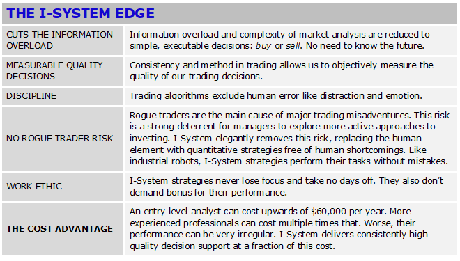 This robust architecture enables I-System to track thousands of intelligent trading strategies in any security market, generating consistent trading signals with zero loss of quality or focus. Its versatility enables the I-System to simultaneously track long-, short-, and medium-term trends and deploy multiple strategies in any market. This in turn dramatically reduces the model risk often associated with lesser quantitative models.
